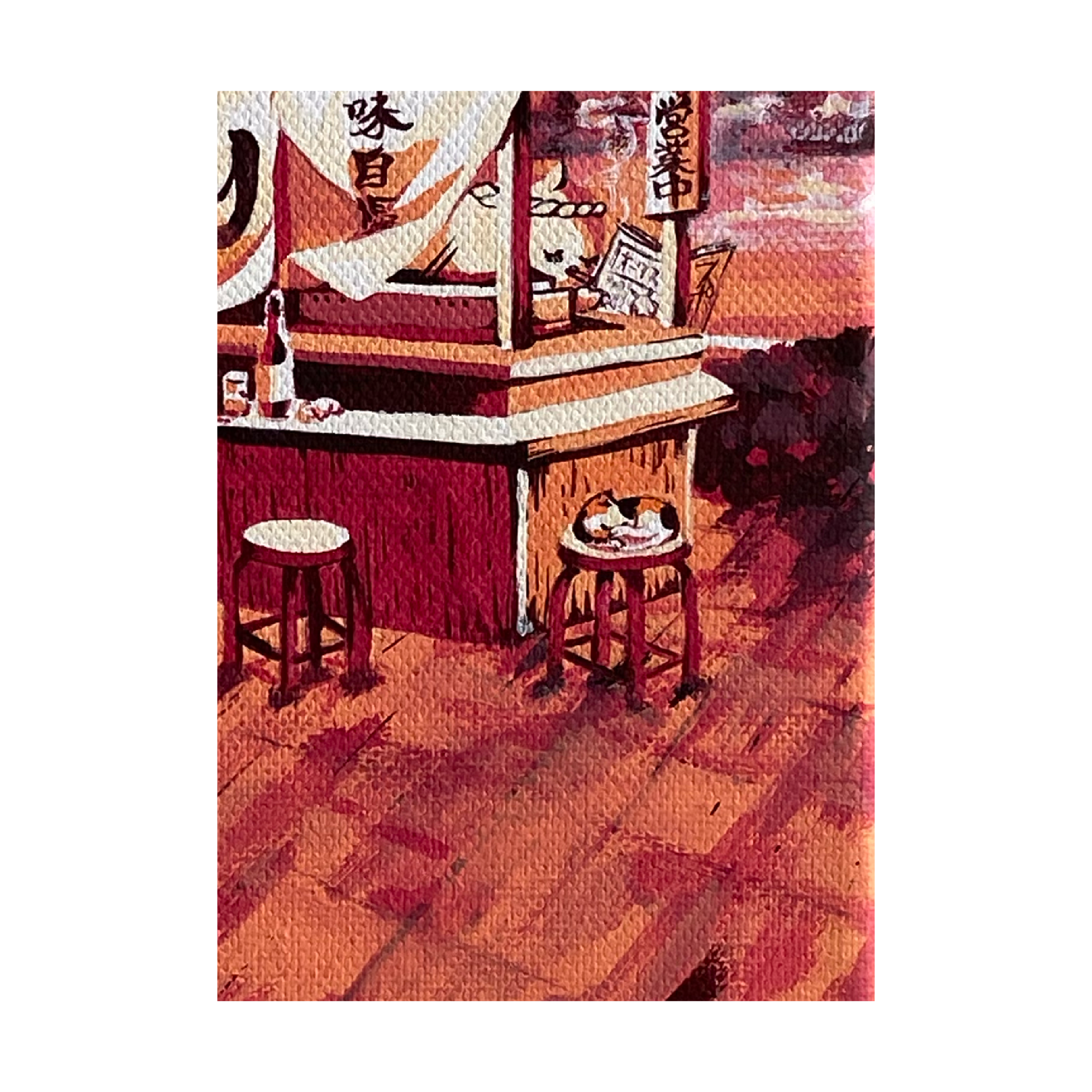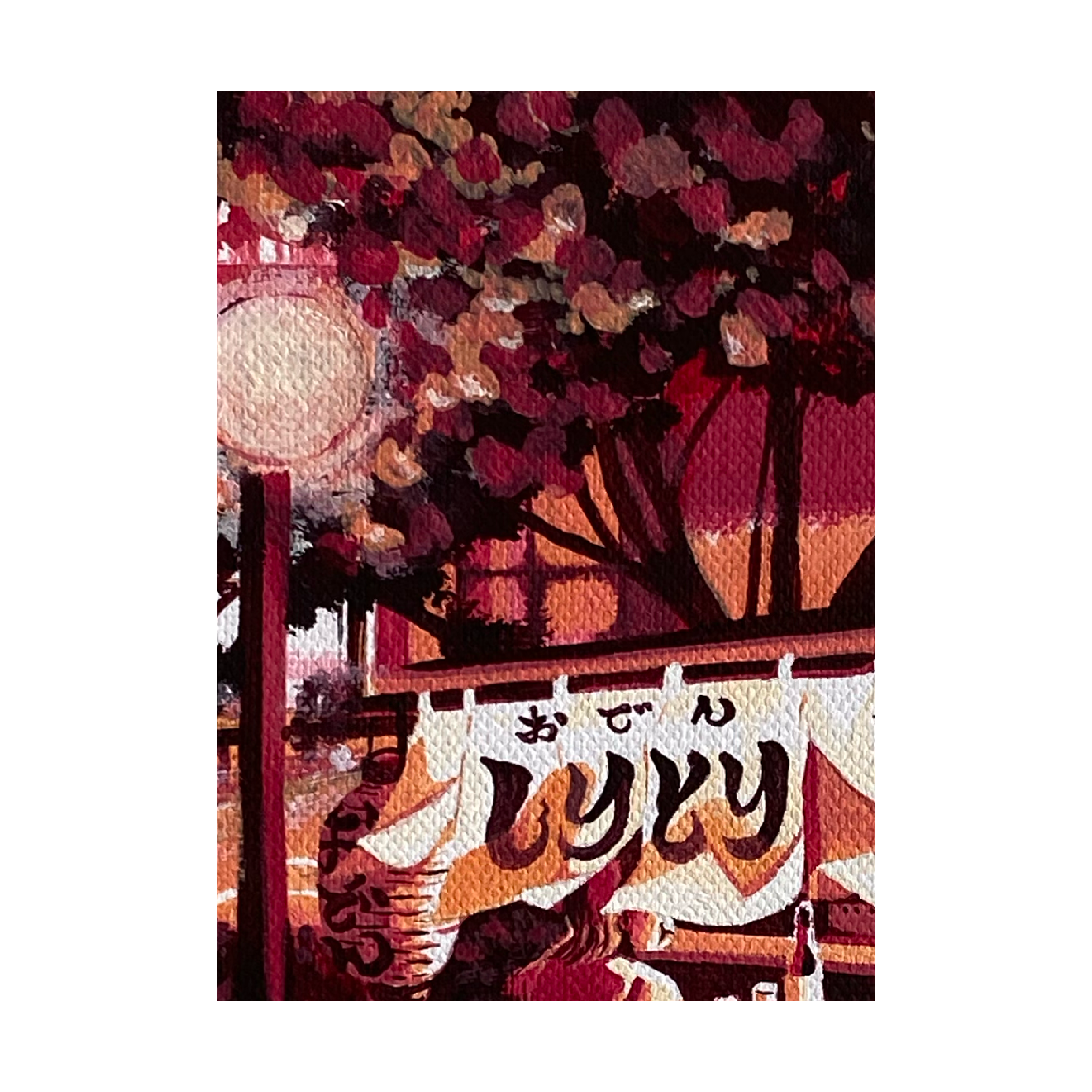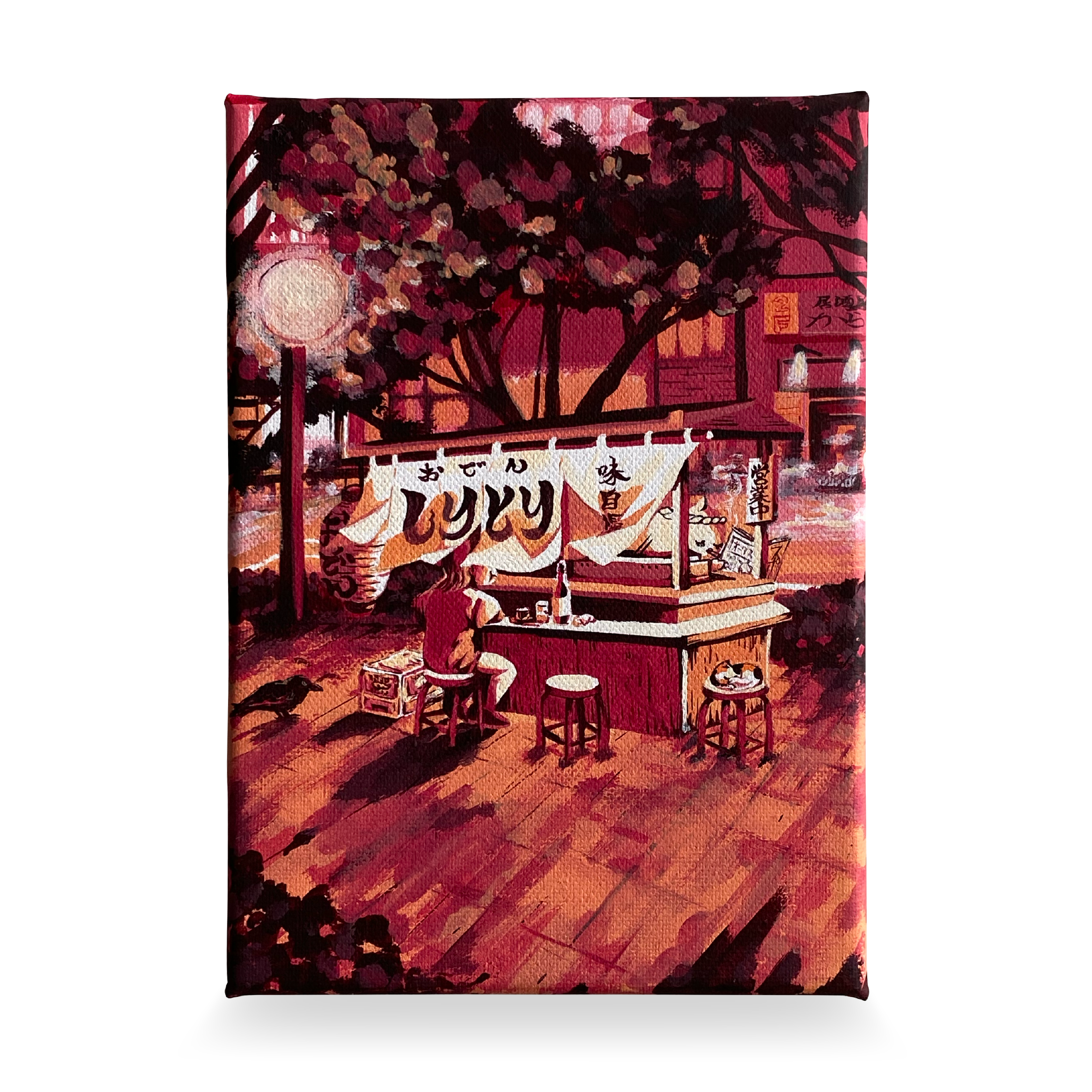 庶民の味「おでん」の屋台をモチーフに出汁のやさしい香りと情景を小さなキャンバスに閉じ込めました。